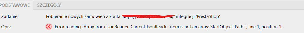 kasia waszczuk 7 Napisano 11 Lutego Udostępnij Napisano 11 Lutego w Integracja z PrestaShop Zgłaszam błąd w integracji z PrestaShop, który występuje w systemie nexo wyłącznie w momencie, gdy na sklepie nie ma nowych zamówień do pobrania. Gdy lista zamówień jest pusta, API PrestaShop zwraca obiekt {} zamiast tablicy [], co powoduje błąd: Error reading JArray from JsonReader. Current JsonReader item is not an array: StartObject. W załączeniu przesyłam zrzut ekranu z pełną treścią błędu. Proszę o informację, czy dostępna jest poprawka obsługująca ten wyjątek, aby puste odpowiedzi z API nie generowały błędów w logach. Zamówienia jak się pojawiają i pobiorę je ręcznie zamówienie wskakuje bez problemu. Obecnie logi mam zaśmiecone właśnie tym błędem Cytuj Link to postu