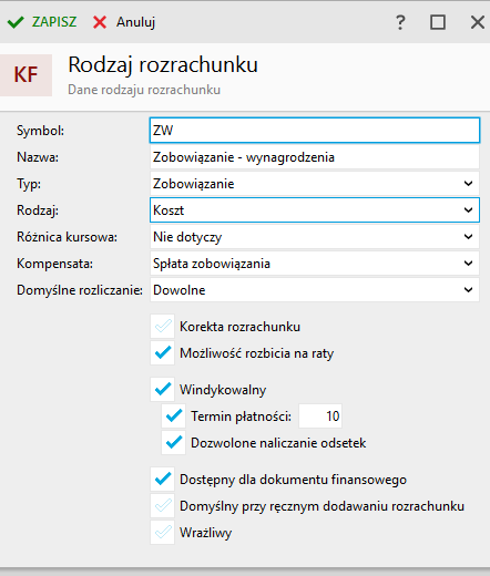 Roman Budzisz 342 Napisano 9 Lipca Udostępnij Napisano 9 Lipca w Termin płatności wynagrodzeń Proszę powołać nowy rodzaj rozrachunku typu Zobowiązanie i określić termin płatności na 10 dni. Ten typ rozrachunku wskazać jako domyślny dla konta rozrachunkowego Rozrachunków z tytułu wynagrodzeń. Program będzie dla tworzonego rozrachunku w zapisie na to konto określał termin na podstawie definicji tego rozrachunku. 1 Link to postu
