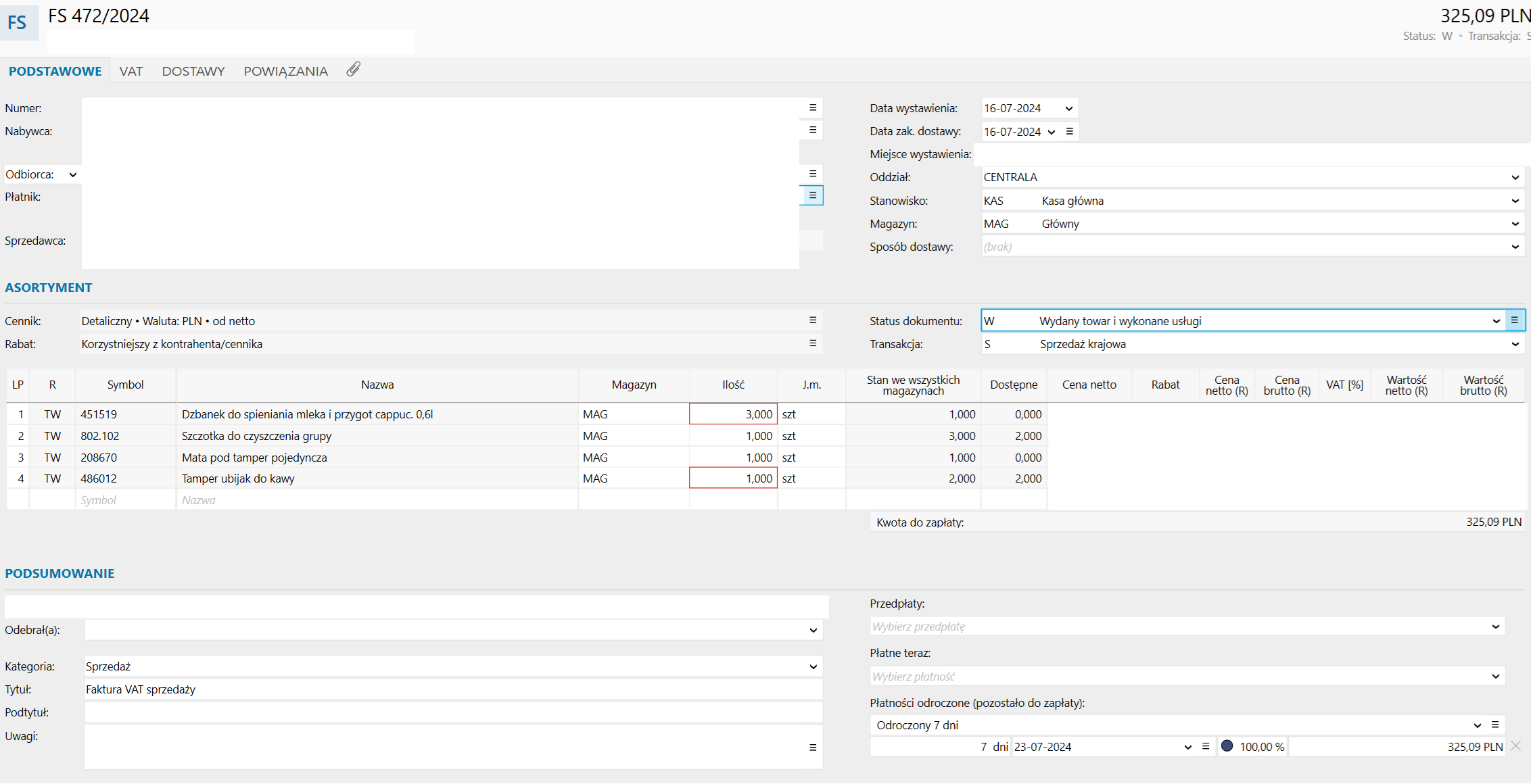 Maciej Ignatowicz 0 Napisano 26 Lipca 2024 Autor Udostępnij Napisano 26 Lipca 2024 w Faktura wystawiona pomimo stanu zero Tak dla 4 pozycji pojawia się to samo. Pomimo, że towaru nie miałem na magazynie - faktura została wystawiona. Chciałbym uniknąć takich sytuacji. Obecnie rozwiązałem to w ten sposób, że usunąłem poz. 4 i wystawiłem prawidłowo fakturę z datą dzisiejszą tylko na poz. 4. Suma wówczas się zgadza. Link to postu