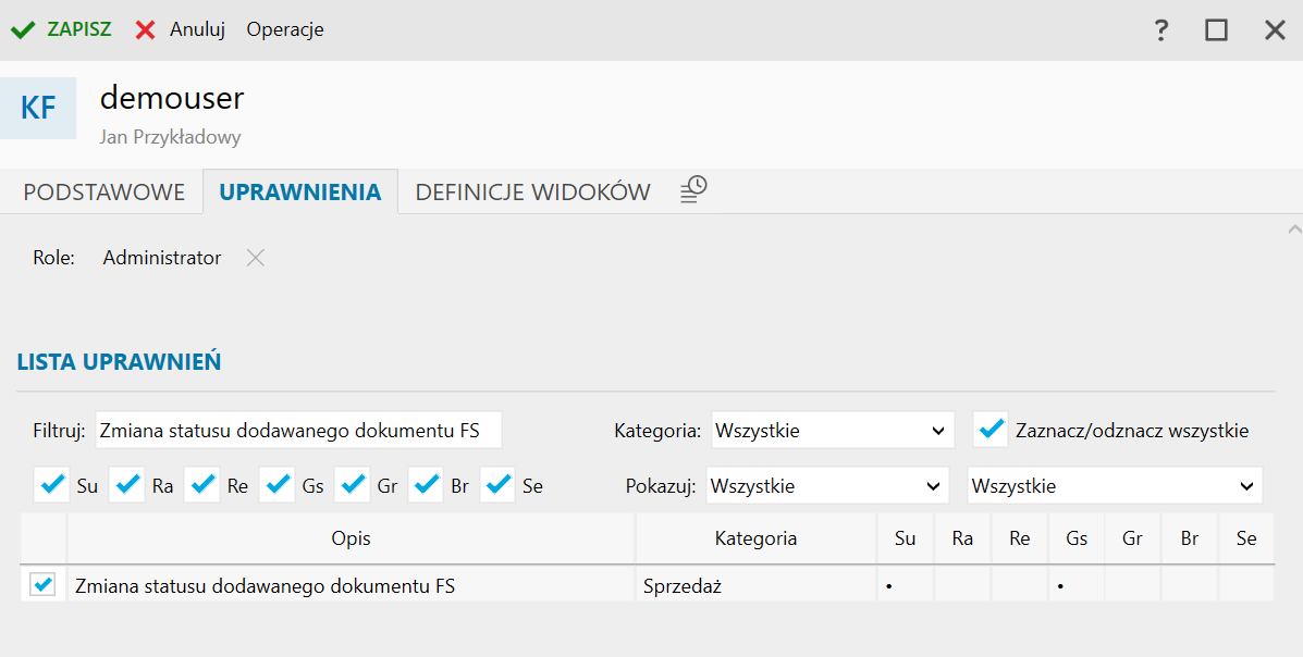 Rozwiązanie Dariusz Nowak 228 Napisano 26 Lipca 2024 Rozwiązanie Udostępnij Napisano 26 Lipca 2024 w Faktura wystawiona pomimo stanu zero 6 minut temu, Maciej Ignatowicz napisał: Sprawa dotyczy obecnie tego jak zablokować sobie możliwość wystawiania faktur z "częściową rezerwacją" Tak jak pisał Pan Błażej: Godzinę temu, Błażej Szolak napisał: Odbierając uprawnienie o nazwie "Zmiana statusu dodawanego dokumentu FS". Można to zrobić w konfiguracji Użytkownicy, na zakładce Uprawnienia. O statusach dokumentów pisaliśmy w temacie e-Pomocy technicznej: Subiekt nexo – Opis statusów dokumentu faktury sprzedaży 1 Link to postu